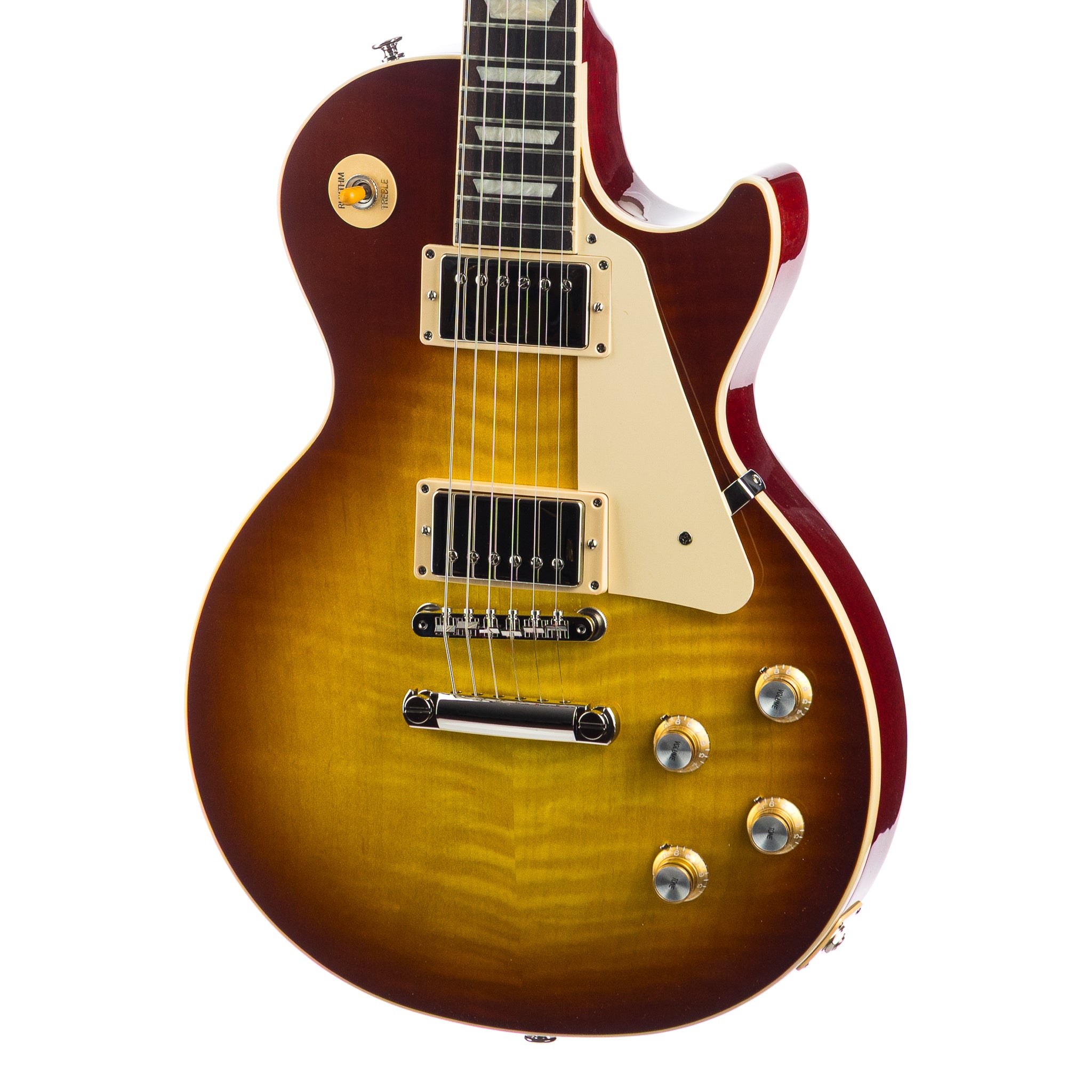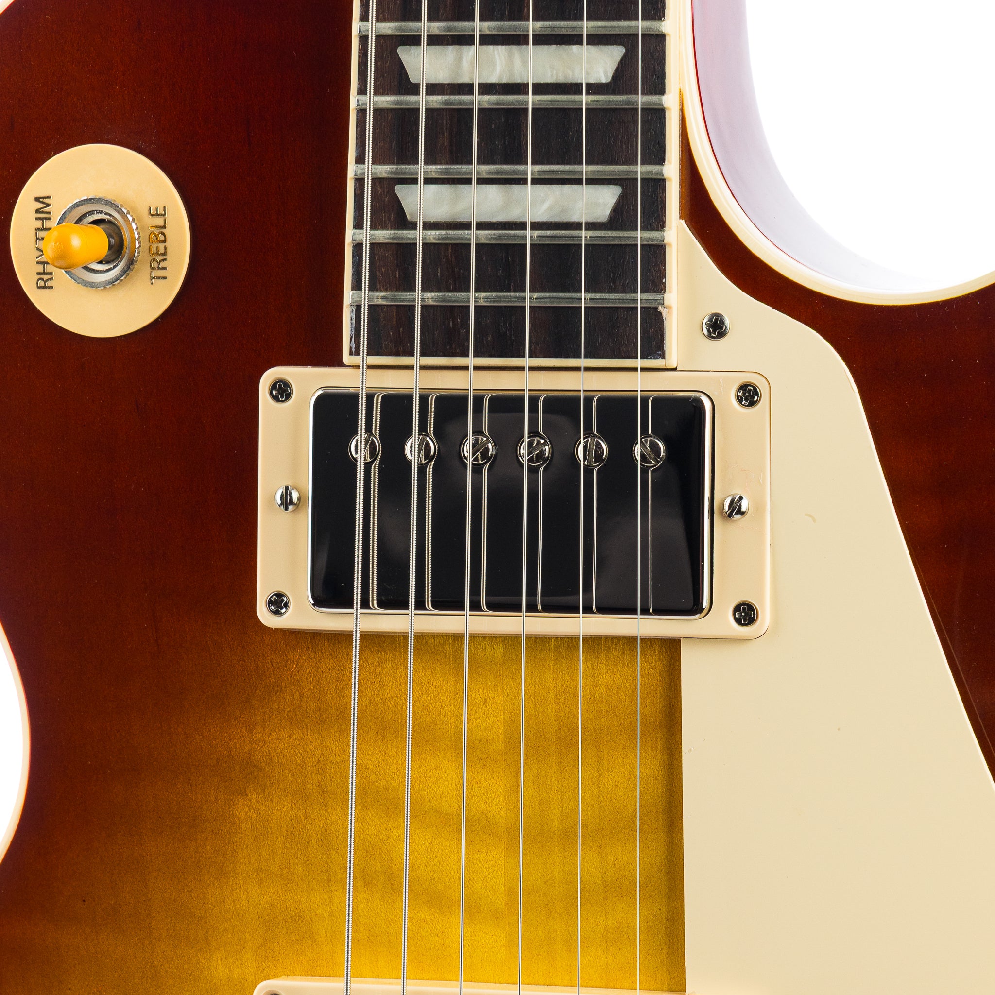 At its sonic core, dual 60s Burstbucker™ pickups with Alnico 5 magnets provide a bold, articulate voice with extra clarity and bite compared to their ’50s counterparts. Handwired with audio taper potentiometers and Orange Drop® capacitors, the controls respond with precision and nuance—allowing seamless pickup blending and tones that travel from smoky blues orbit to full-throttle rock eruption. Gold Top Hat knobs with silver reflectors complete the unmistakable early-’60s aesthetic.