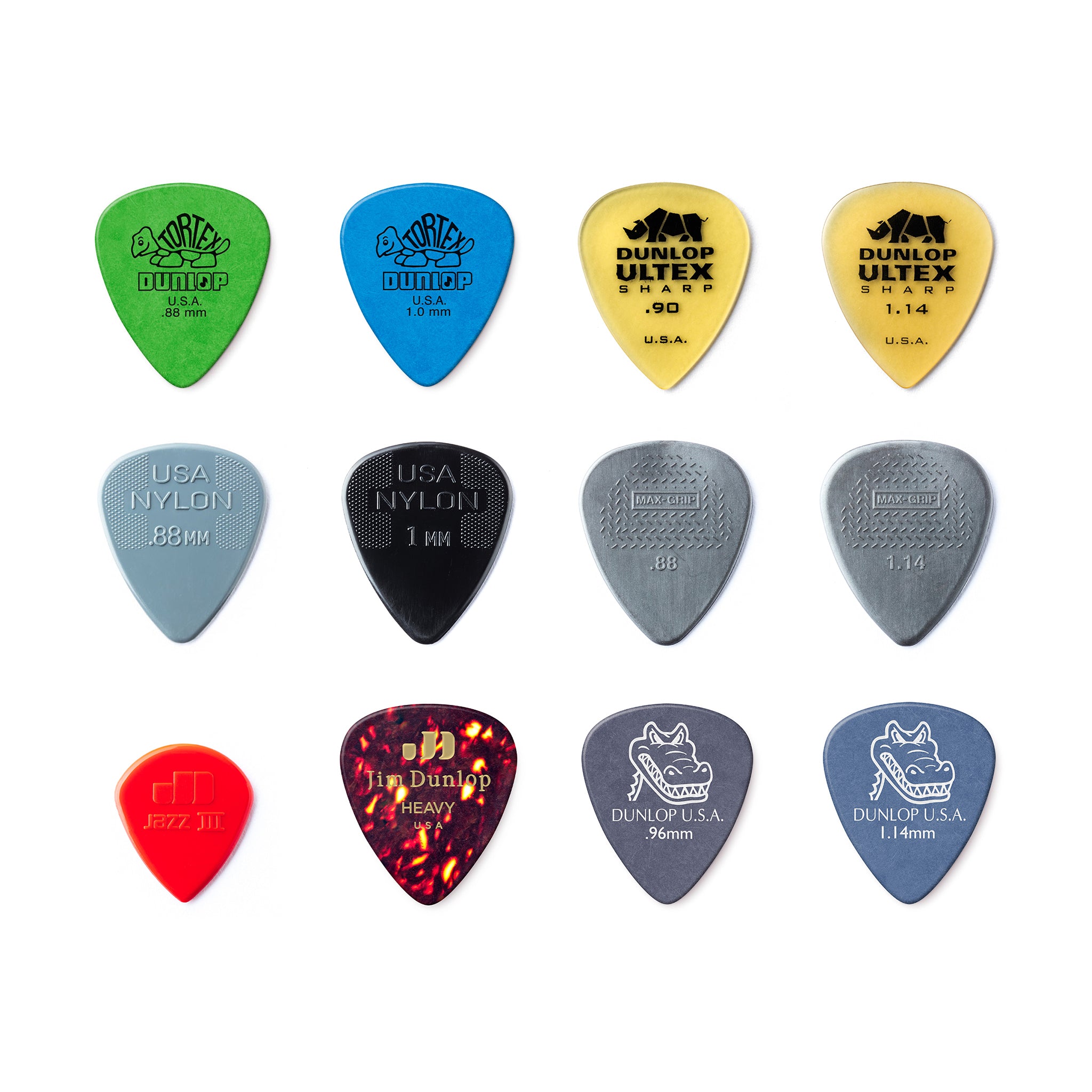 With this Dunlop Pick Variety Pack, players can sample 12 of our most popular Nylon Jazz III, Nylon Standard, Max-Grip, Celluloid, Gator Grip, Tortex, Ultex medium and heavy gauge picks in one convenient pack.
