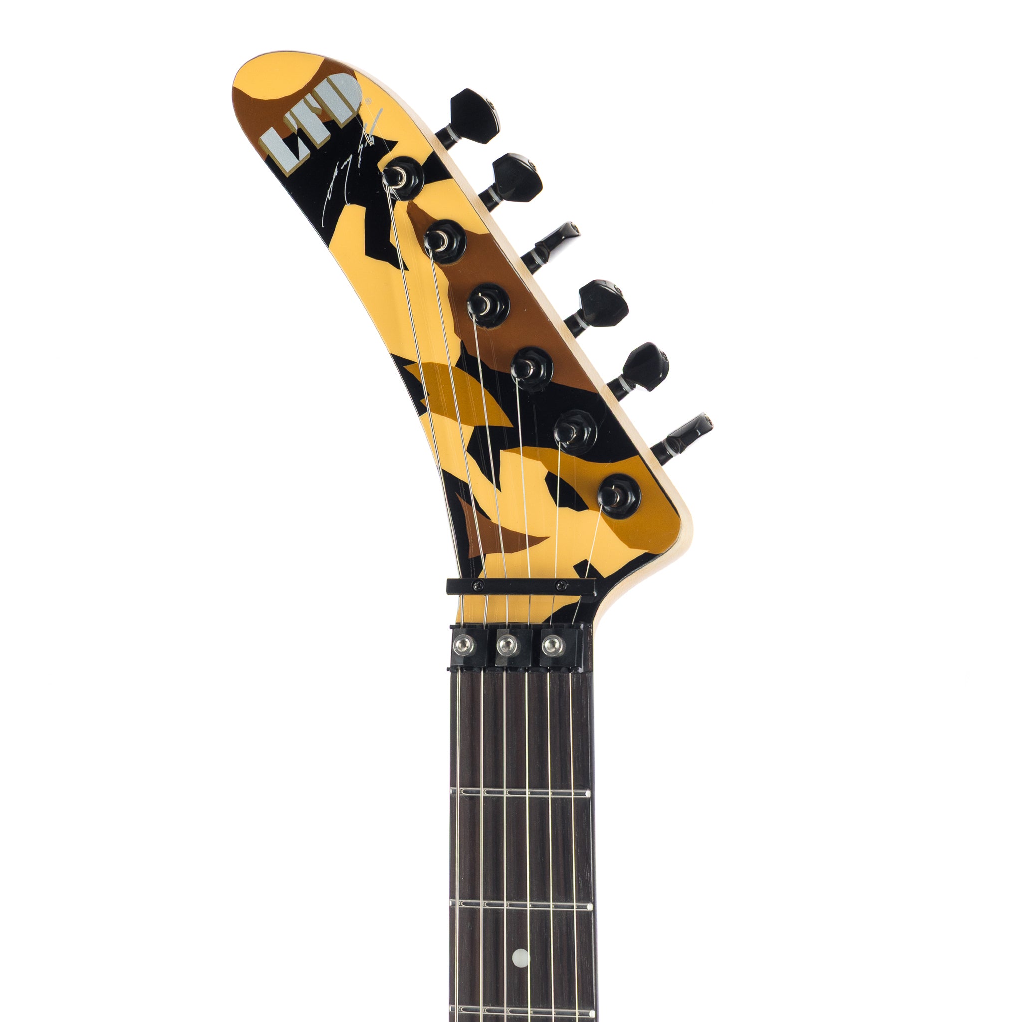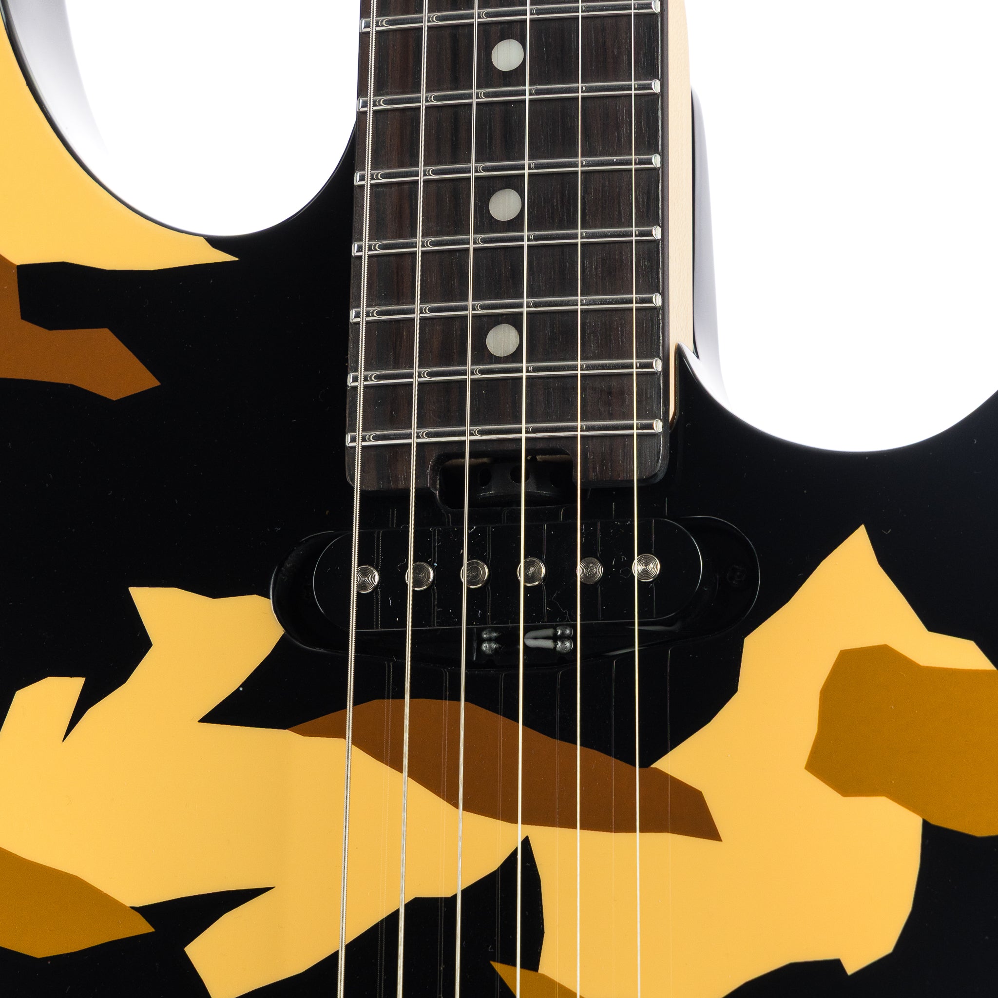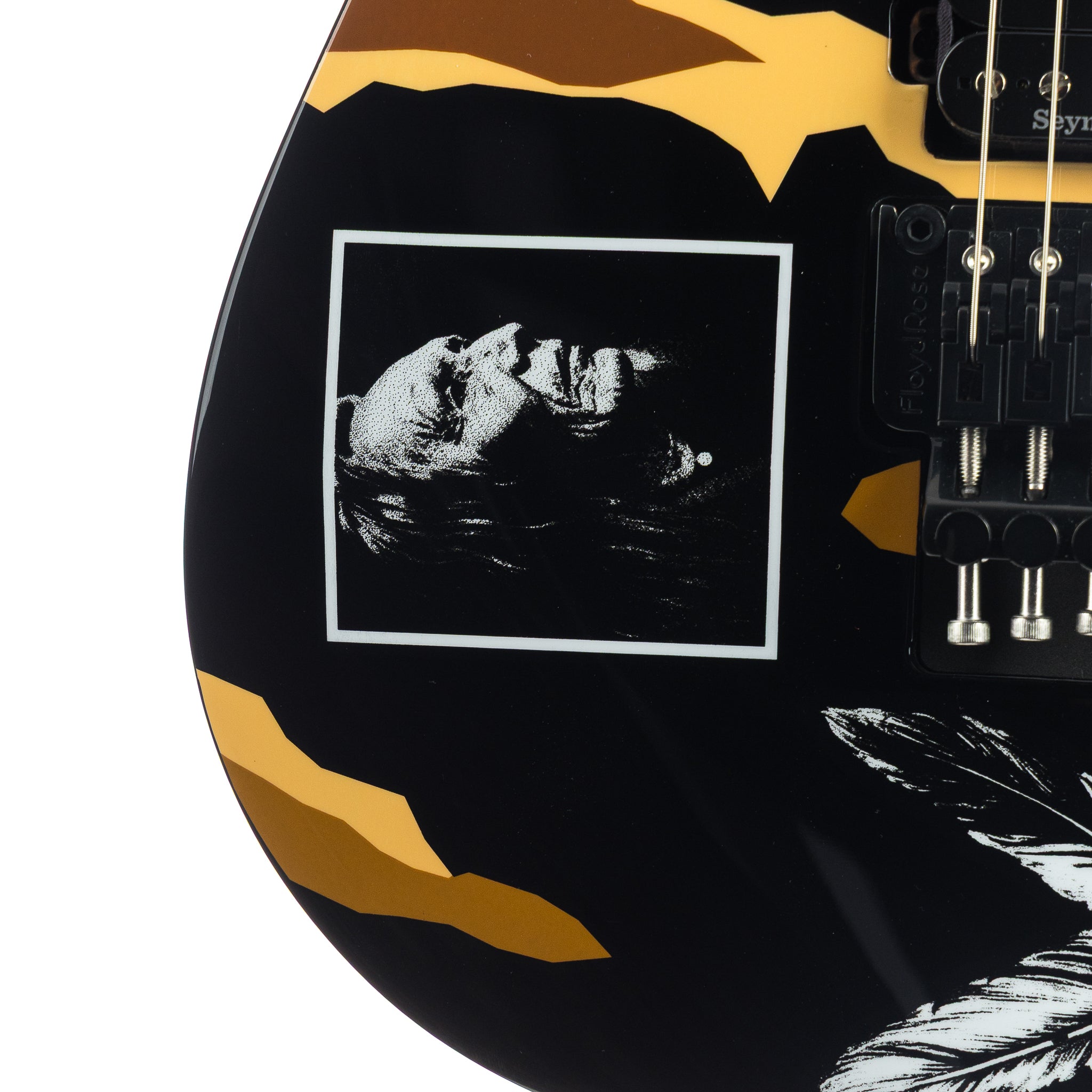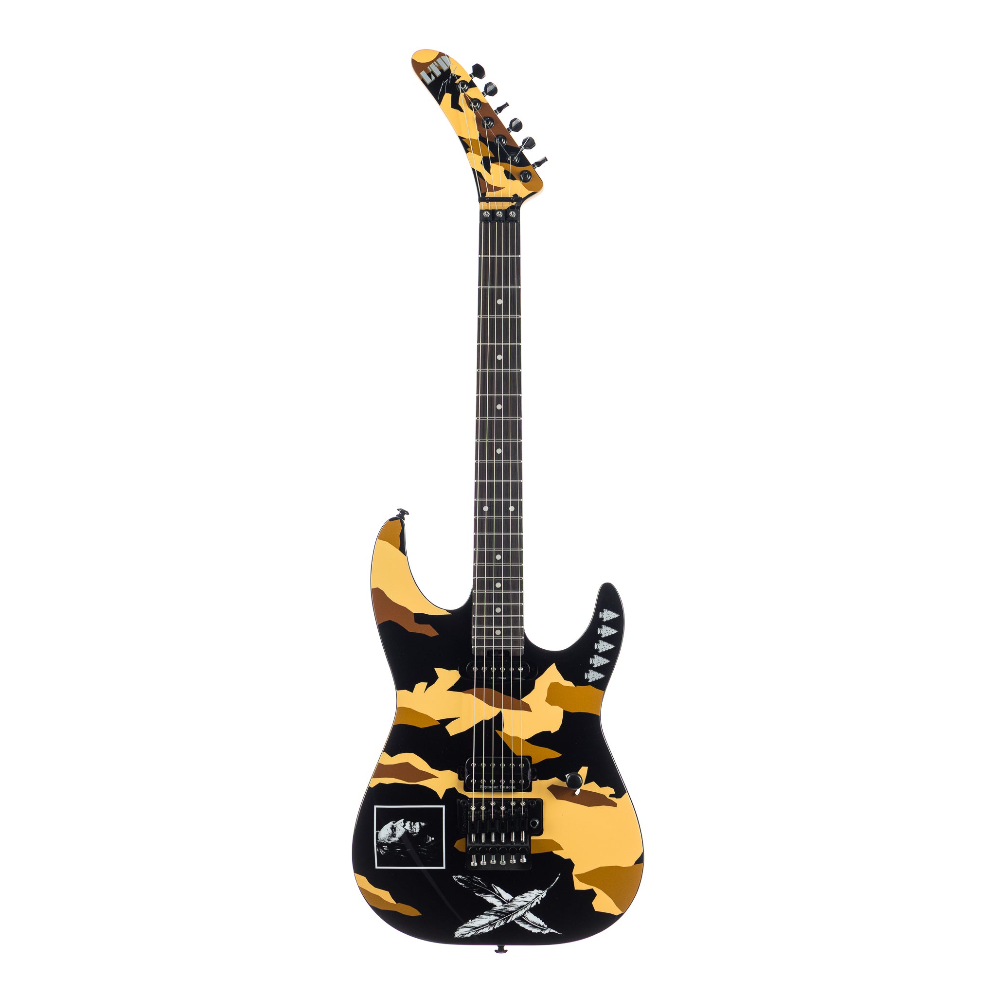 Under the hood, the Desert Eagle soars with a high-impact combination: a Seymour Duncan ’78 in the bridge for vintage-hot, harmonically rich bite, paired with an ESP LS-120 single-coil in the neck for expressive contrast. A push-pull volume knob switches pickups instantly, giving you George’s preferred control layout. The Floyd Rose 1000 SEwith stainless screws and a low-friction volume pot provide rock-solid stability and performance, ready for dive-bombs, flutters, and wild tonal acrobatics.