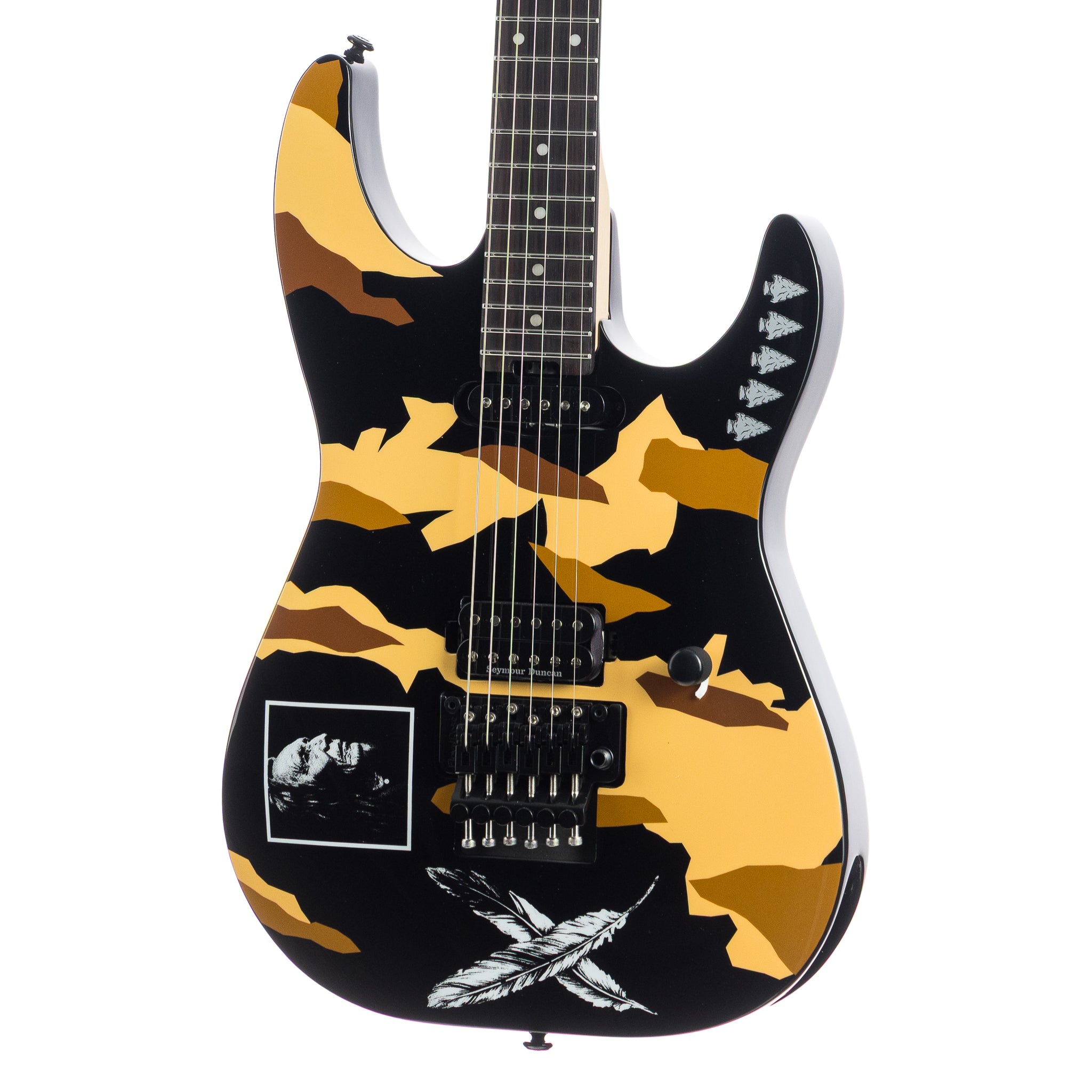 Built with a resonant alder body and maple neck, the Desert Eagle features classic bolt-on construction at a 25.5" scale, delivering the snap, clarity, and punch that defined George’s groundbreaking style. The striking artwork trades the Kamikaze’s symbols for elegant double feathers and arrowheads, wrapped with subtle black body binding for a design that’s powerful, refined, and unmistakably Lynch.