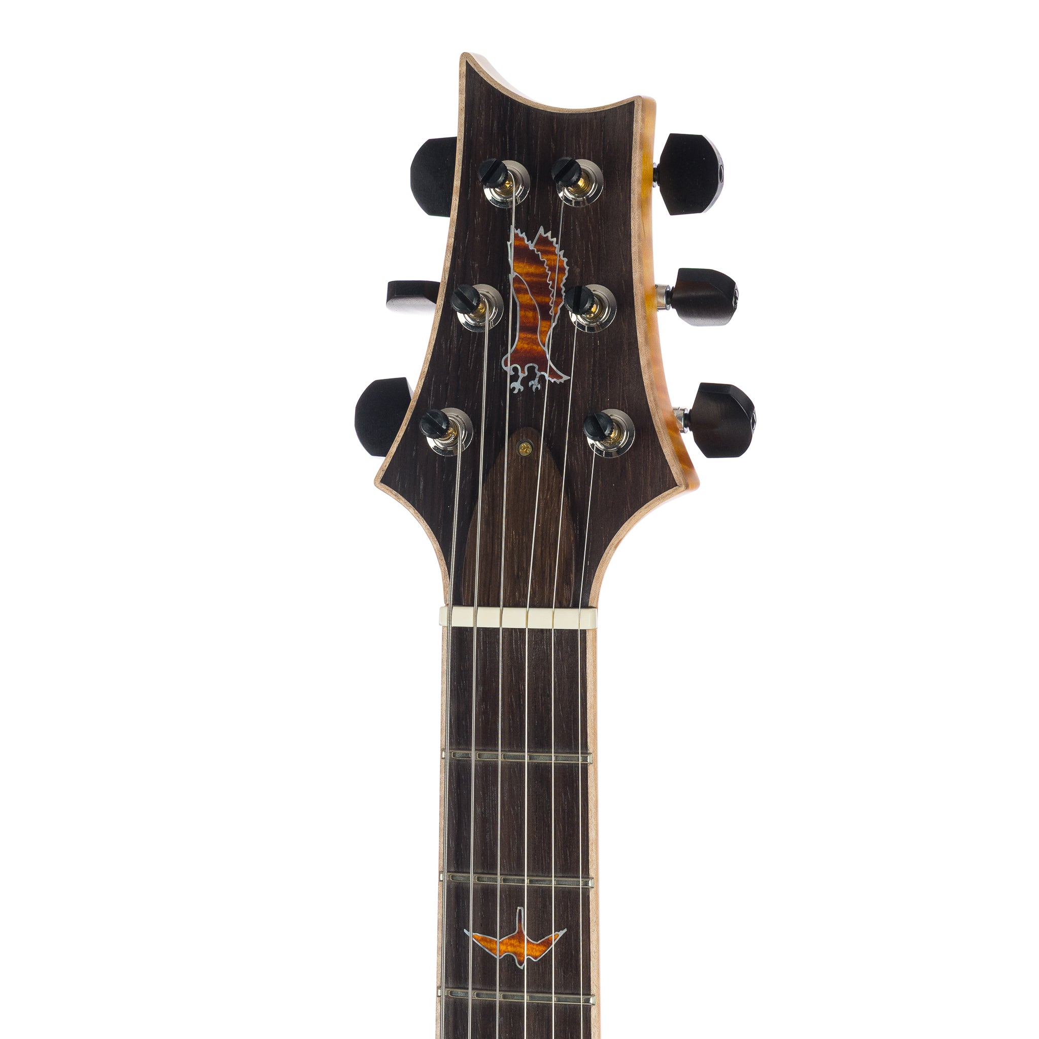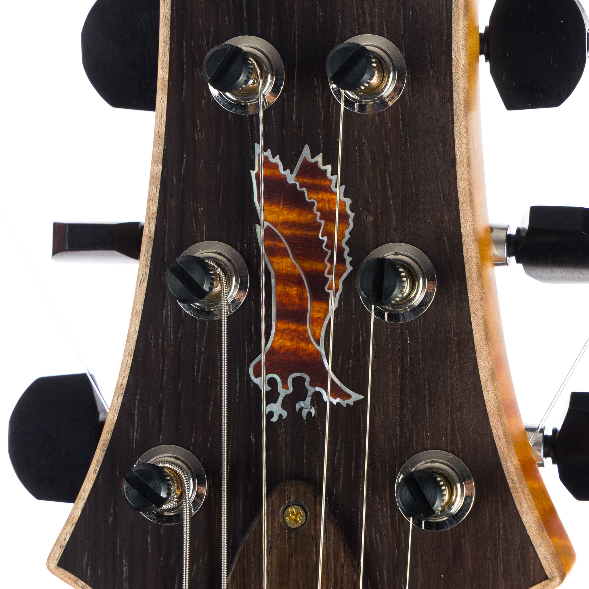 Headstock Veneer Inlay: Curly Maple Private Stock Eagle stained to match with White Mother of Pearl outline