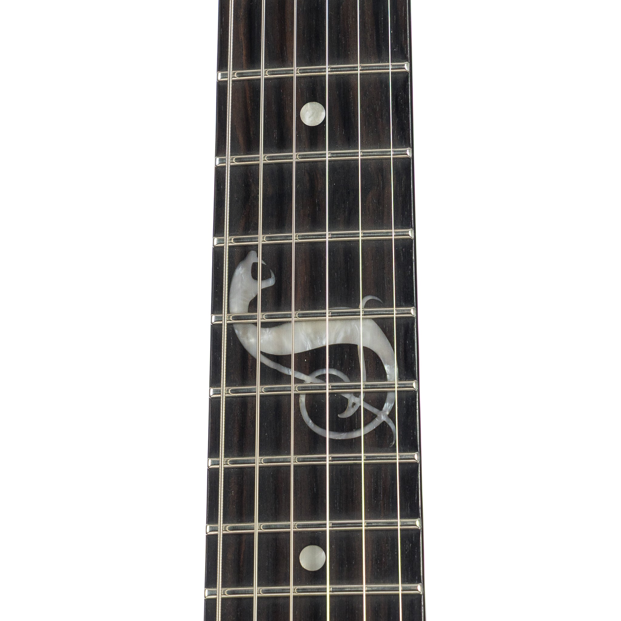 Its 24.75" scale set-neck construction, mahogany body, and three-piece mahogany neck create a resonant, punchy backbone with the fast attack and midrange authority Hetfield is famous for. The ebony fingerboard with 22 extra-jumbo frets offers effortless playability, while the signature 12th-fret snake inlay adds the perfect touch of Hetfield attitude.