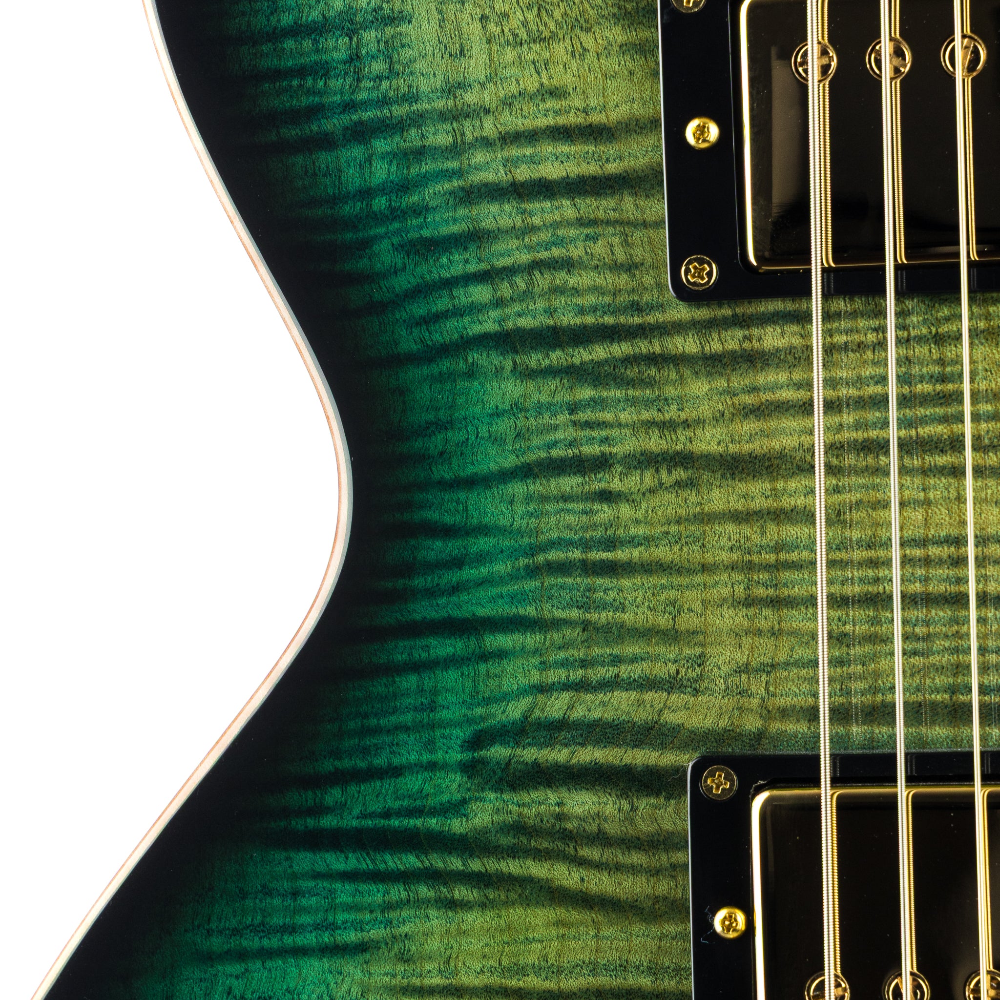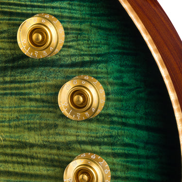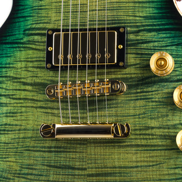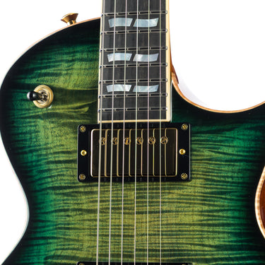 This Eclipse starts with a full-depth (60mm) weight-relieved mahogany body, delivering the authority and sustain you expect while keeping the instrument balanced and stage-ready. It’s topped with a beautifully figured flame maple cap, wrapped in natural binding, and finished in a striking Dark Lime Sunburst gloss that shifts between menace and elegance depending on the light.