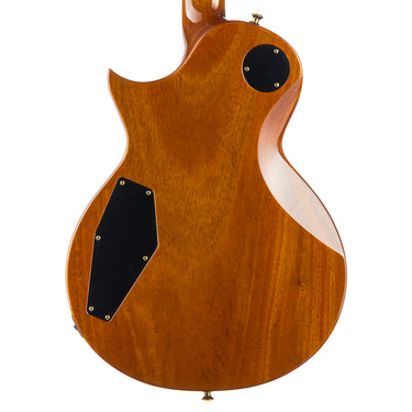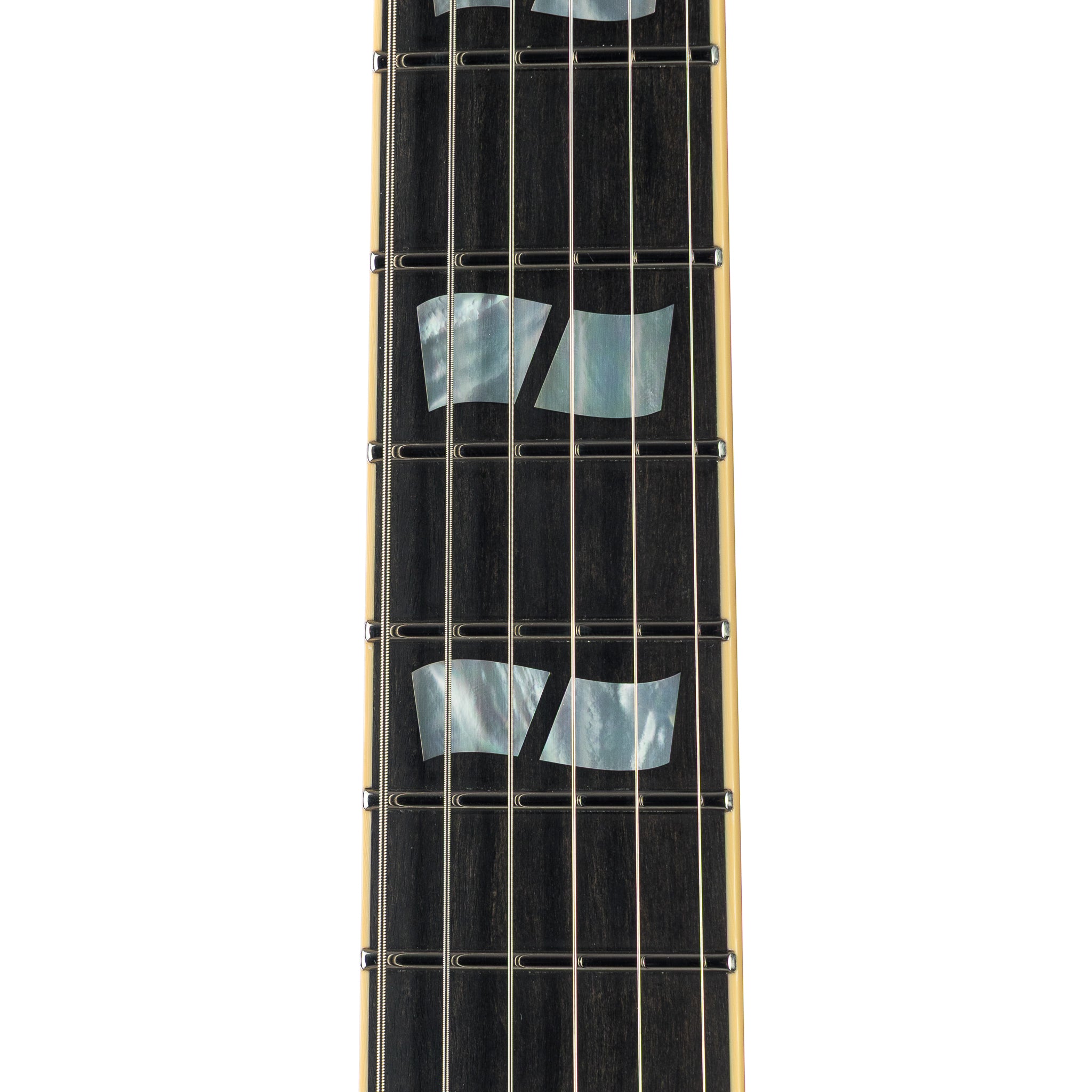 The 3-piece set mahogany neck features ESP’s Thin “U” carve (20mm–22mm), paired with a 24.75” scale and 14” radius — a fast, comfortable platform that feels broken-in from the first chord. The ebony fingerboard with creme binding and Jescar FW57110 XJ frets offers glassy smooth bends and articulate attack across the board.