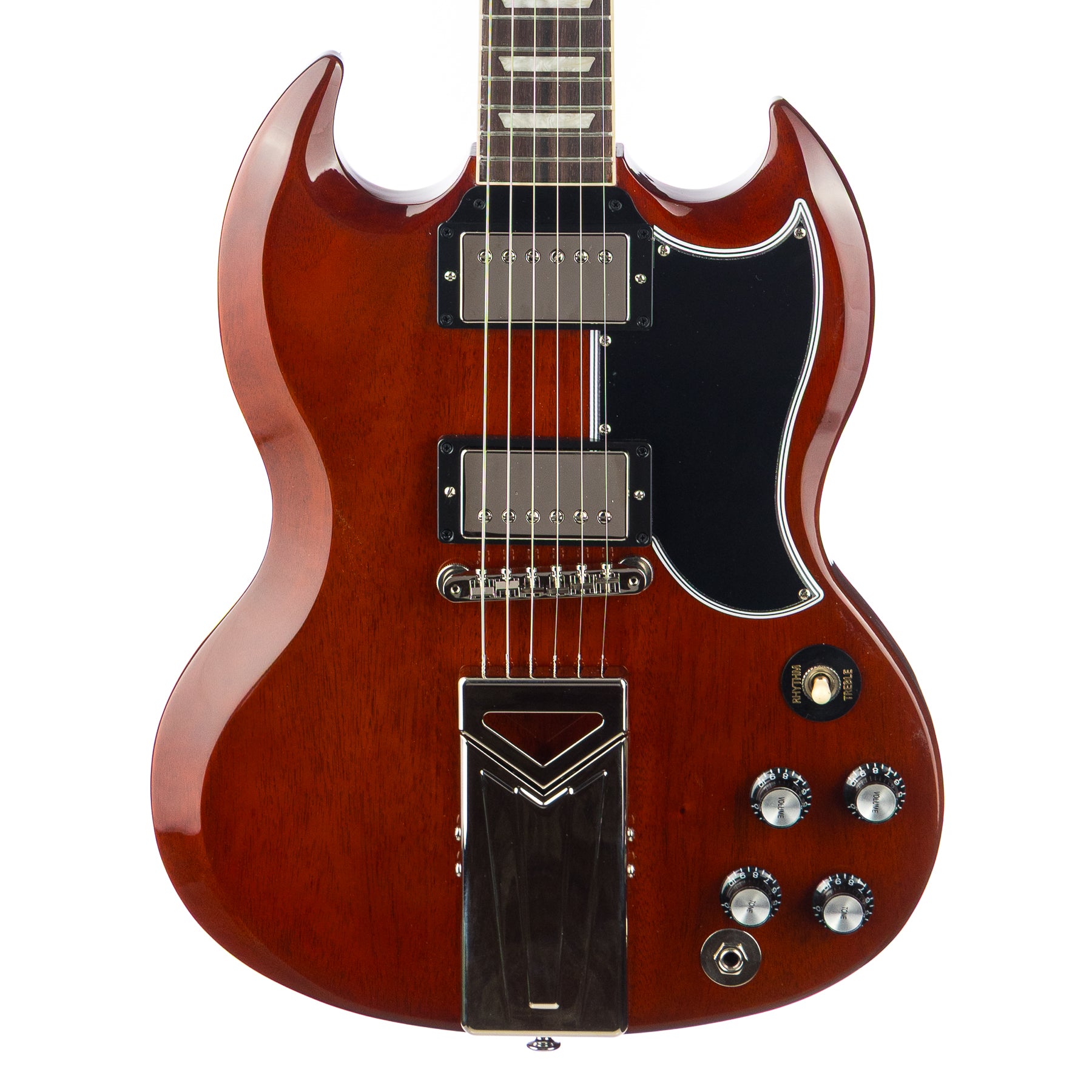 A standout visual element is the Sideways side-pull vibrato system, inspired by early ’60s designs. For this signature edition, the vibrato arm is removed and replaced with a blocked Vibrola tailpiece, anchoring the hardware while preserving its striking retro aesthetic. The result is a fusion of classic SG design and Jake’s unmistakable style, giving players stability while keeping the visual magic of the original mechanism.