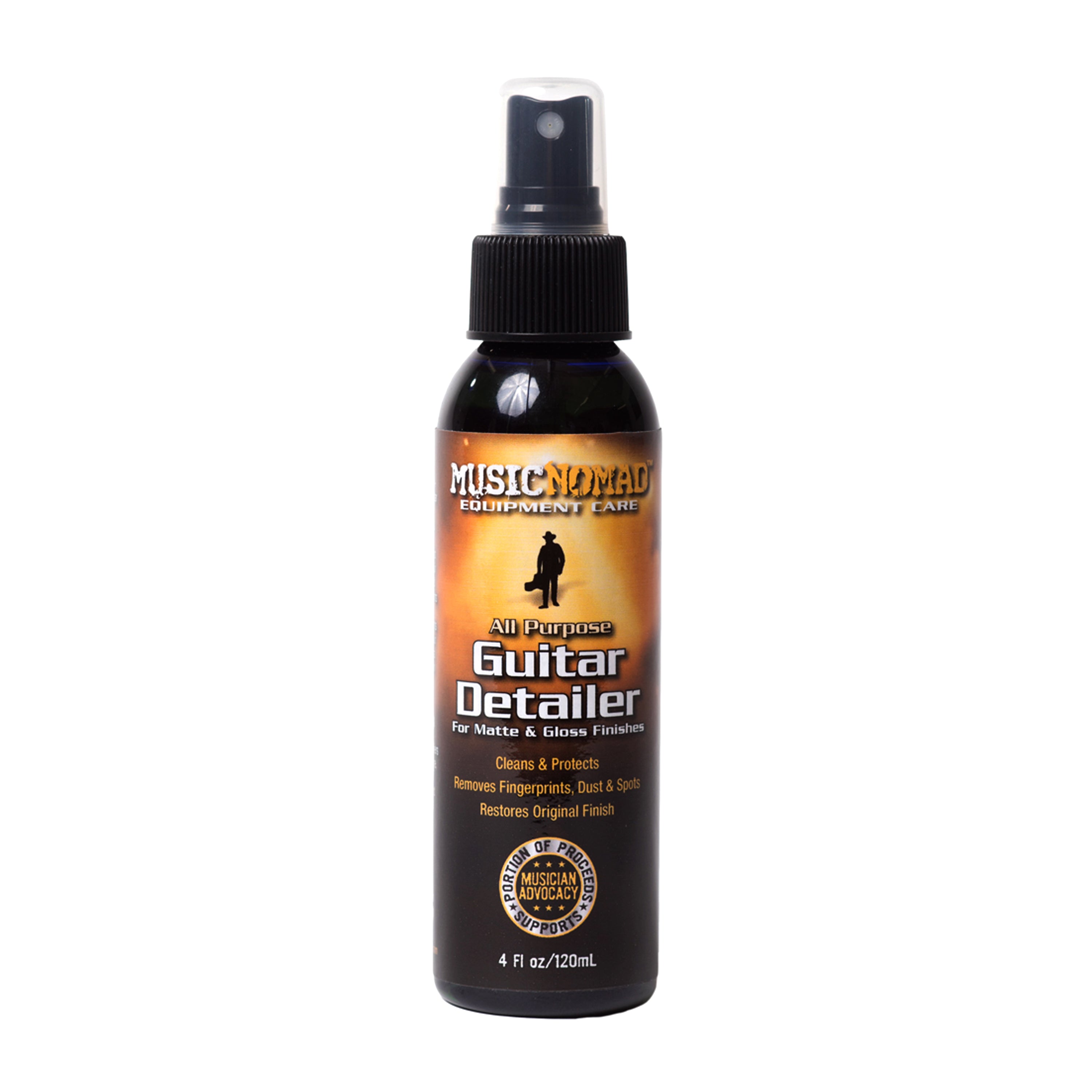 Nothing plays like a clean guitar. MusicNomad's detailer puts everything you need to care for your guitar in one easy spray and wipe product. It works great on both matte/satin & gloss finishes. A single spritz from our atomizer cleans fingerprints, dust & smudges on your guitar finish like no other product. Whether you are cleaning your electric guitar, acoustic guitar, bass guitar or ukulele we just made your care and maintenance easier. Our special formulation is infused with gloss enhancers & UV protectants to restore your guitar to its original showroom look. Our anti-static agents help reduce dust from binding to your guitar. Small in size but big in results you can take it everywhere, and it even smells great.