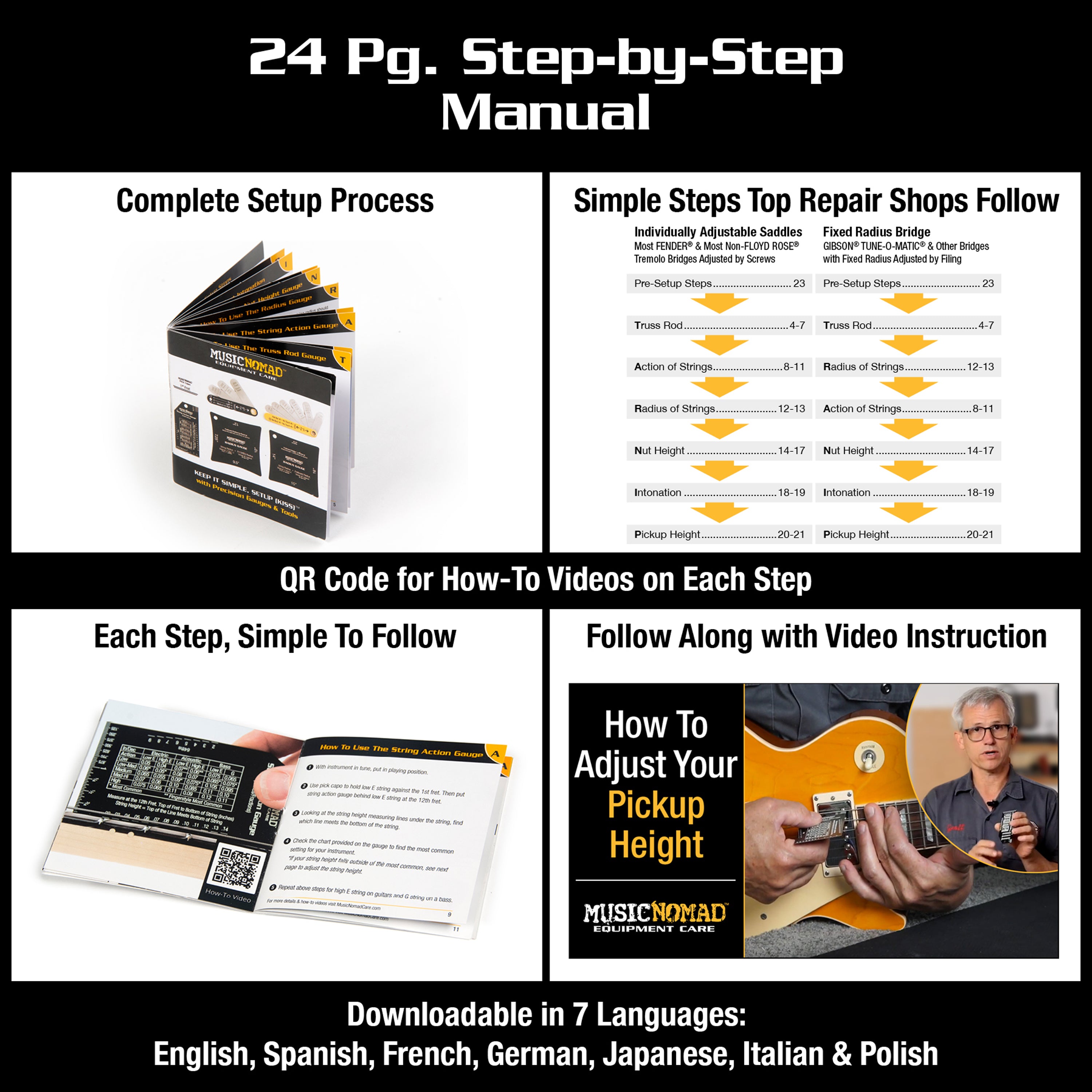 The 6 pc. Precision Gauge Setup Set includes a: Truss Rod Gauge, Pick Capo, String Action Gauge, 2 Radius Gauges, & Nut Height Gauge. We even include a 24 page instructional booklet & a nice carrying case.