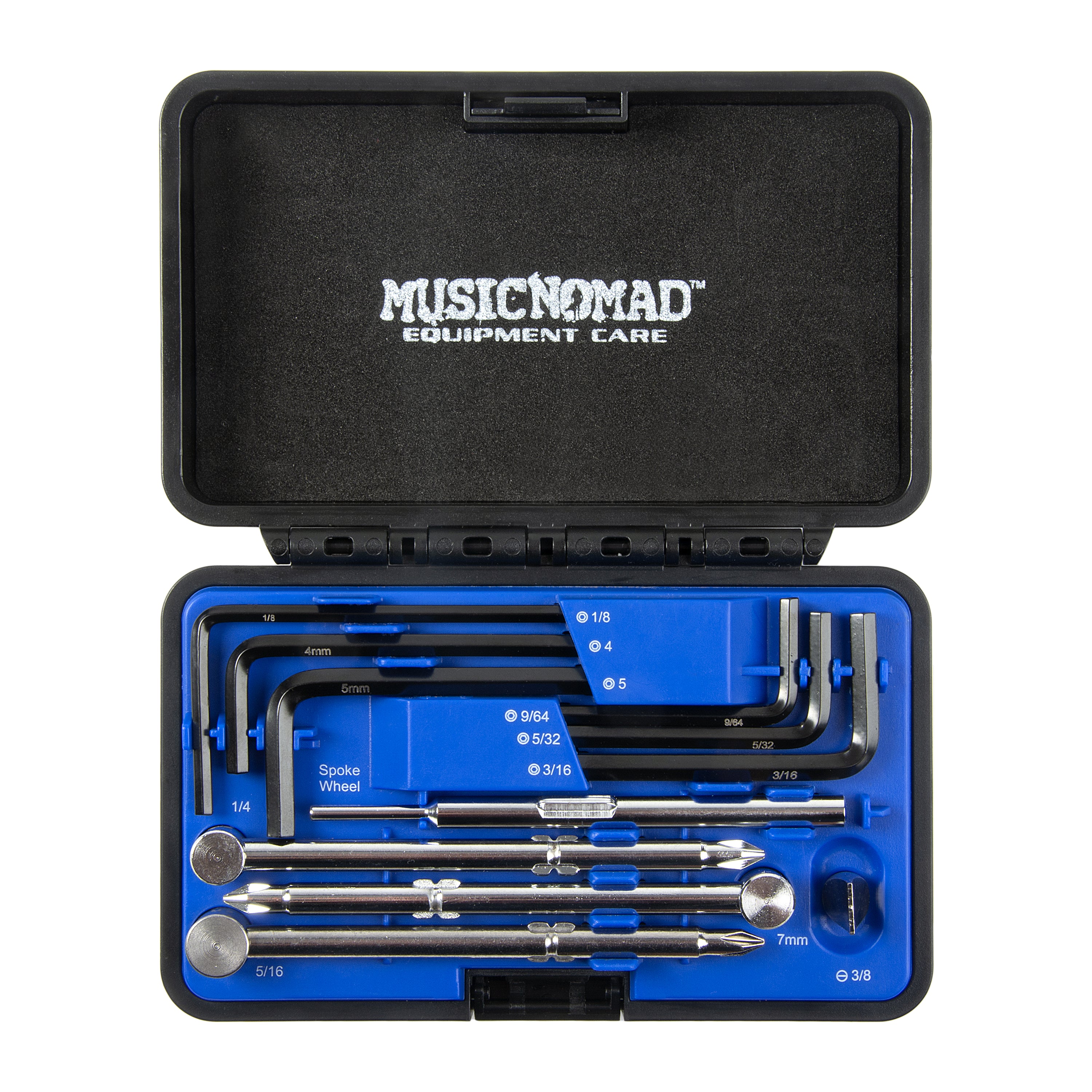 Guitar Tech 11 pc. Truss Rod Wrench Set includes: 6 Allen key sizes: 5/32", 9/64", 1/8", 3/16", 4mm, 5mm and 3 Socket Wrench sizes: 1/4", 5/16", 7mm and each includes a PH#1 magnetized screwdriver for truss rod covers and Special designed Spoke Wheel tool, plus 3/8" Flat Head Screwdriver Blade bit for certain truss rods at the heel. Compact, Lightweight and Strong Aluminum Case.
